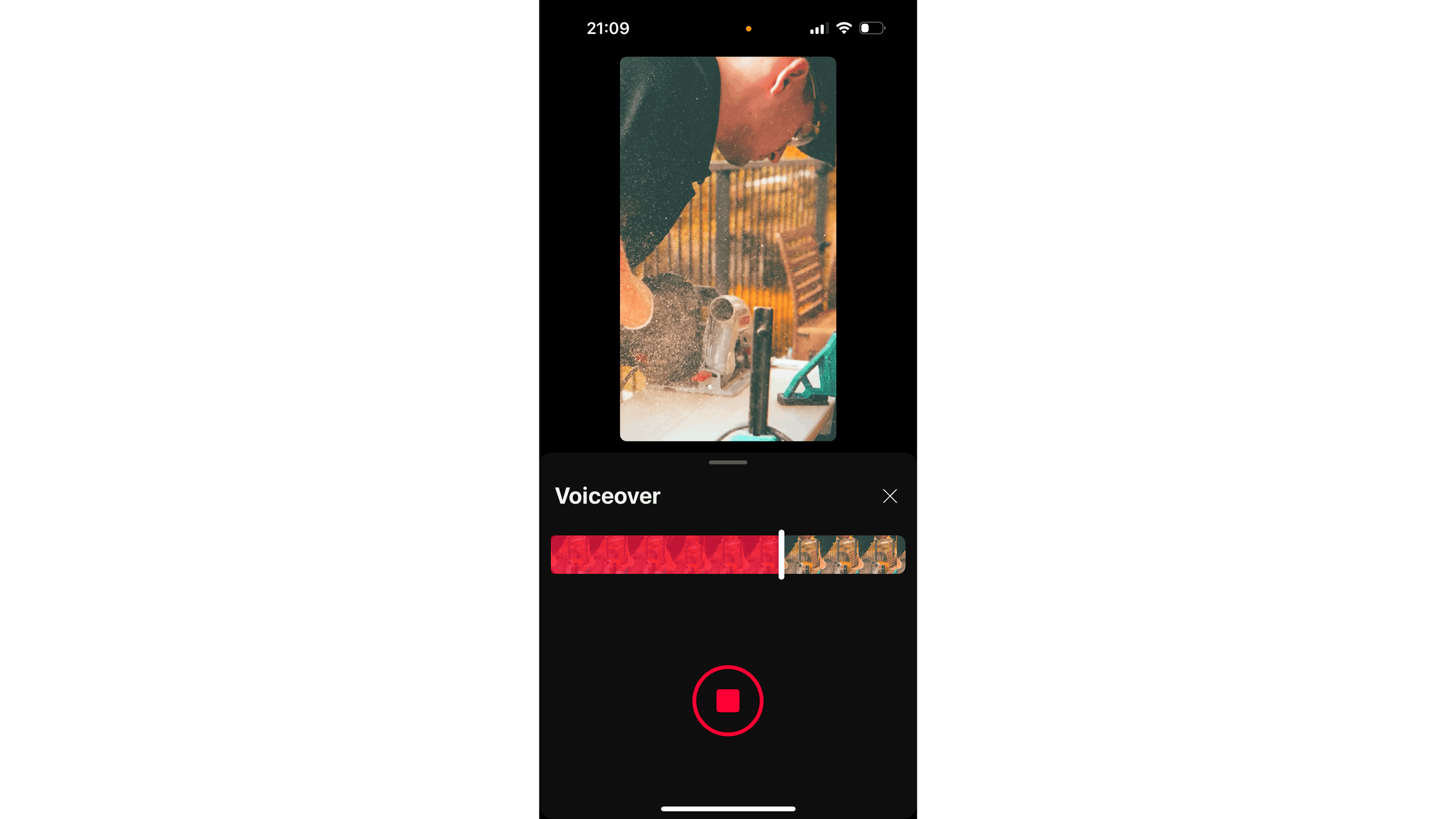 In de sectie Geluid toevoegen zit ook de knop Voice-over. Wanneer je op het pictogram van het microfoontje tikt, kun je beslissen waar de voice-over begint en waar je hem stopt. Tik op de rode knop om de opname te starten of houd je vinger op de knop om de audio op te nemen.