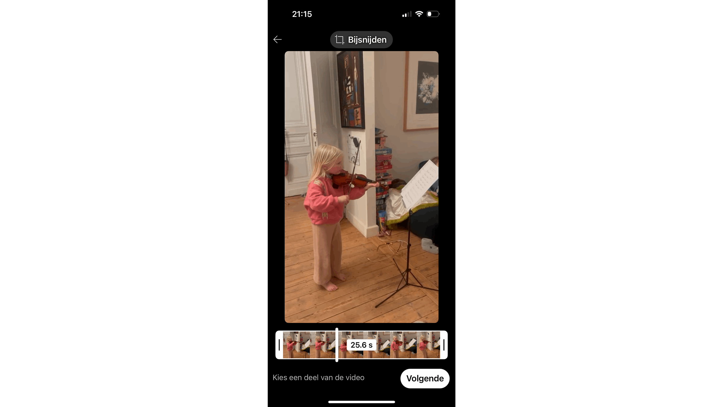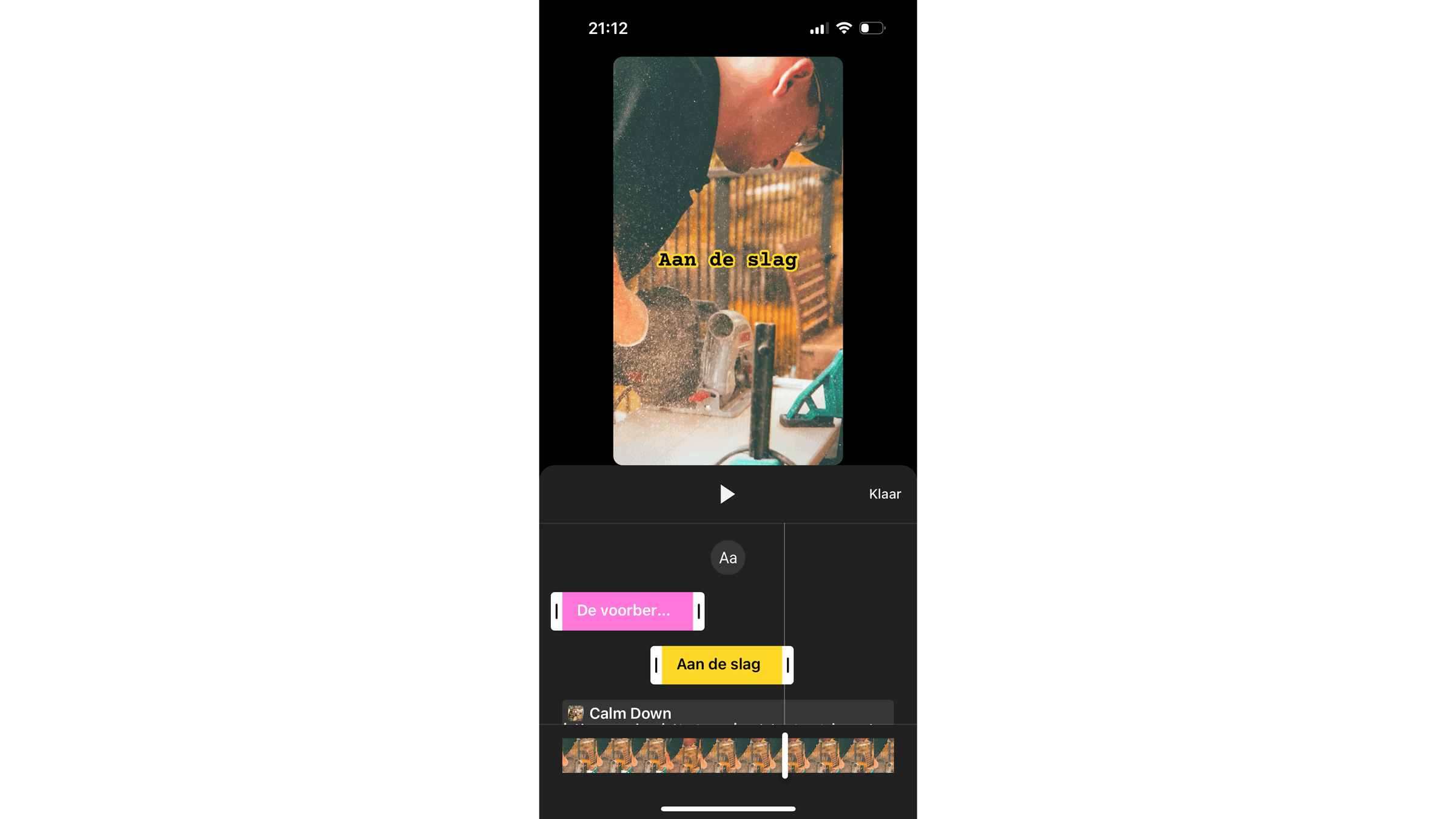 Nu kom je op een scherm om de voorvertoning te bekijken. Voordat je onderaan op de knop Volgende tikt, gebruik je de knop daarnaast: Tijdlijn. Hier zie je alle elementen waaruit je Short bestaat in gekleurde balkjes: de video, de muziek, de voice-over, tekst 1, tekst 2 en verder. Bij elk balkje kun je aangeven wanneer het begint en wanneer het stopt. Op die manier maak je op je telefoon een vrij nauwkeurige montage. Speel het filmpje af en corrigeer tot je helemaal tevreden bent. Tik dan op Klaar.
