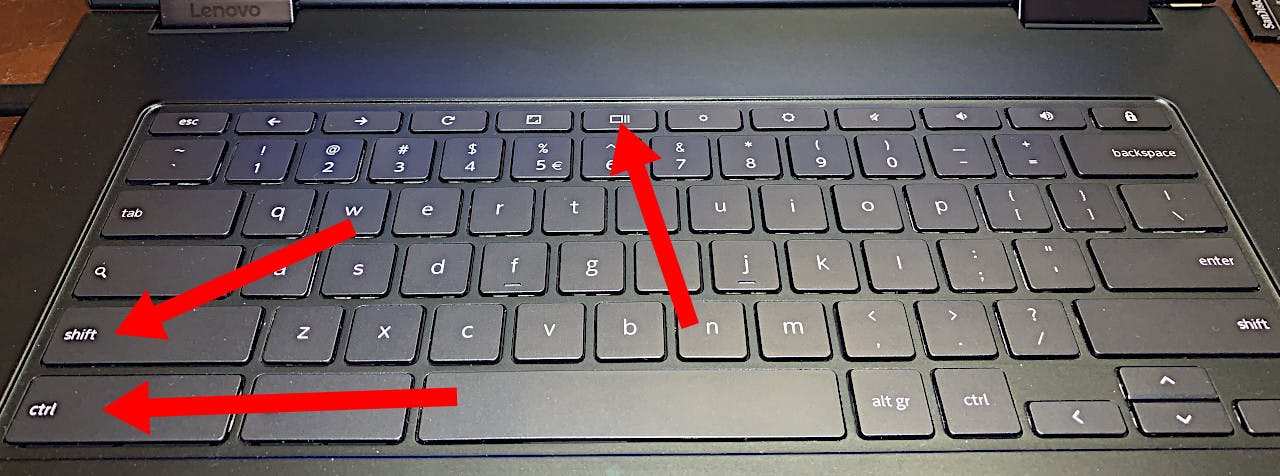 Als je zo eens op het toetsenbord van je Chromebook kijkt, zie je daar geen PrtScn- of PrintScreen-toets tussen zitten. Een schermafdruk maken lijkt er dan ook niet in te zitten. Geen angst: daar is toch wel degelijk een toetsencombinatie voor. Zij het een wat onlogische, maar dat mag de pret niet drukken. Druk op de toetscombinatie Control-Shift en dan de toets (bovenste rij) die eruit ziet als een vierkantje met daarnaast twee verticale streepjes. Solo wordt die gebruikt om geopende vensters op een overzichtelijke manier in beeld te brengen. En in combinatie met Control en Shift dus om screenshots te maken. Druk er op en het hele scherm wordt een tintje donkerder.