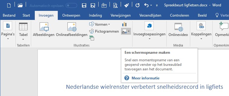 Klik op het tabblad Invoegen bovenaan op de Office-werkbalk. Op de werkbalk worden nu de opties voor het invoegen van informatie in een Office-document getoond. Klik bij Illustraties op Schermopname, afhankelijk van de grootte van het scherm zie je alleen een klein pictogram van een wit vlak met een kleine camera of de volledige tekst Schermopname. Er opent nu een menu met verschillende opties. Wil je een schermafdruk van een heel venster invoegen, dan kun je dat venster direct selecteren. Wil je een deel van een venster, klik dan onderin het menu op Schermopname. Het Office-document minimaliseert en je kunt met je muis het deel van het venster selecteren dat je wilt vastleggen. Het wordt netjes op de juiste locatie in het Office-document ingevoegd.