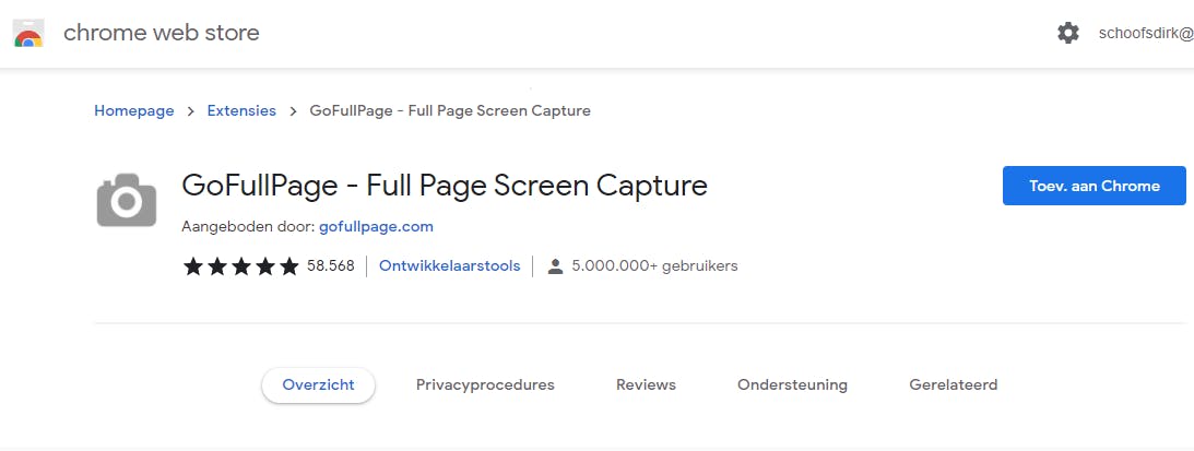 In Chrome moet je wel een extensie installeren. In de Chrome Webshop zoek je de extensie GoFullPage. Als je de Chrome-extensie hebt geïnstalleerd, klik je op het GoFullPage-pictogram boven in de rechterhoek van de browser.