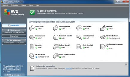 Het beginscherm van AVG is overzichtelijk maar wie dieper in de opties wil moet veel klikken en weten wat hij doet.