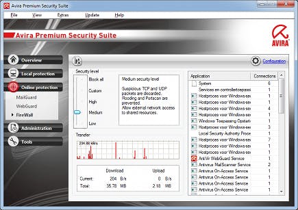 Avast! 5.0 heeft een nieuw uiterlijk gekregen dat erg duidelijk is en bijvoorbeeld direct laat zien of het systeem goed beveiligd is. Alle onderdelen van de suite zijn bovendien via de tabbladen direct toegankelijk. Het aanpassen van een instelling is nooit meer dan vier klikken weg. Uniek ten opzichte van de andere titels in de test zijn de ‘schilden’. Dit zijn specifieke beveiligingsfuncties voor bijvoorbeeld instant messaging, P2P of e-mail. Het P2P-schild controleert specifiek downloads van bijvoorbeeld BitTorrent of eDonkey. De configuratie gebeurt grotendeels automatisch maar soms is het nodig een programma handmatig toe te voegen aan een schild. Mooi is ook de Sandbox, waarbij elk willekeurig programma in een veilige virtuele omgeving kan worden gebruikt. De firewall werkt met drie zones maar maakt niet helder wat het precies betekent als één daarvan gekozen is. Een minpuntje: om de systeemgrafieken te zien is ineens een Flash-player vereist.