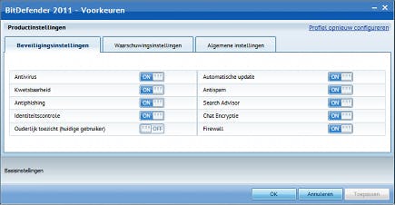 BitDefender gaat verder waar het vorig jaar was gebleven. Toen was de vernieuwde interface een hele verbetering maar nog niet helemaal af. Nu is die dat wel en kan de gebruiker er echt zijn voordeel mee doen. BitDefender biedt maar liefst drie verschillende niveaus voor de interface: van een basisweergave via gemiddeld naar een gevorderdenweergave. Hoe moeilijker de weergave, hoe meer opties en hoe meer informatie de gebruiker te verwerken krijgt. BitDefender biedt antivirus, antispam en een firewall, maar ook bescherming van de privacy, ouderlijk toezicht en optimalisatietips voor de pc. De laatste zijn van een lachwekkend soort en totaal niet nuttig, onduidelijk is wie BitDefender hiermee denkt te helpen. Leuker is het overzicht van kwetsbaarheden dat onder meer opmerkt dat Autorun is ingeschakeld (voor automatisch starten van usb-sticks en cd’s) en (onterecht) dat het gebruikte wachtwoord van het Windows-account te zwak is.