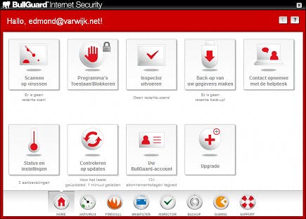 Bullguard is een van de producten in de test die behalve eigen techniek ook delen van de suite in licentie heeft van anderen. Zo heeft het voor antivirus een licentie op de engine van BitDefender en is de firewall gebaseerd op een engine van Agnitum, bekend van de Outpost-firewall. Bullguard tweakt die onderdelen en voegt er opties aan toe. Bovendien zegt men de producten gebruiksvriendelijker te maken. Er zijn een paar nieuwigheden in versie 10 ten opzichte van de vorige versie (nog niet zo heel lang geleden door ons getest). Ten eerste de mogelijkheid om delen van het programma met een wachtwoord te beveiligen, daarnaast een Inspector die de computer afspeurt naar verouderde en daarom onveilige software en tot slot een service die controleert of Bullguard wel actief is en niet door een ander programma is uitgeschakeld. Bullguard Internet Security bestaat uit antivirus, antispyware, firewall, antiphising, spamfilter, en 5 GB ruimte voor online back-up. De back-up hoeft trouwens niet online, het programma ondersteunt ook cd, dvd en netwerk- en usb-schijven.