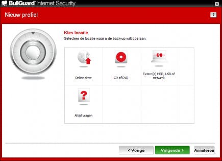 De back-up van BullGuard kan zowel op cd, dvd, externe usb- en netwerkschijf als ook online geplaatst worden.