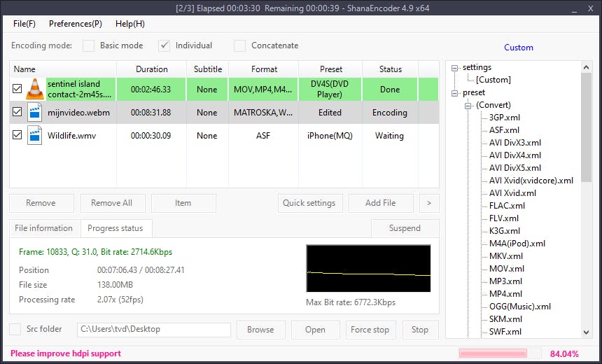 Handig is nog dat je vanuit het contextmenu een voorbeeldweergave van het uitvoerresultaat kunt beluisteren of bekijken, waarbij bijvoorbeeld ook al rekening wordt gehouden met videobeelden die je hebt bijgesneden of gesegmenteerd (ook die functies zitten in ShanaEncoder). Standaard belanden de uitvoerbestanden op je bureaublad, maar dat heb je snel aangepast.
