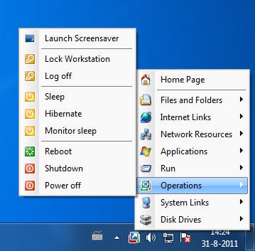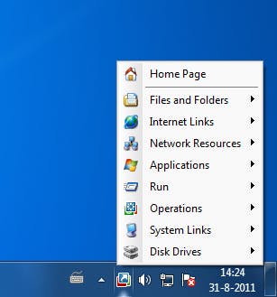 De werking van Shortcuts To Tray is heel eenvoudig. U start het programma waarna het zich automatisch plaatst in het systeemvak binnen Windows (rechtsonder, naast de klok). Het is portable, dus u kunt het bij u dragen op een usb-stick en vanaf daar starten. Door vervolgens met de linkermuisknop op het pictogram van Shortcuts to Tray te klikken, opent u het menu. U ziet direct een lijst met subcategorieën waarin u handelingen kunt uitvoeren, bijna alle snelkoppelingen voegt u zelf toe. Zo kunt u rechtstreeks mappen en bestanden openen vanuit dit menu, maar ook programma's starten, systeemhandelingen uitvoeren enzovoort.