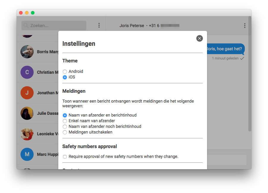 De synchronisatie van chats begint pas op het moment dat je de extensie hebt geïnstalleerd. Oudere chats worden niet naar de desktopversie gesynchroniseerd. Het is helaas niet mogelijk om groepsgesprekken te starten vanuit de desktopversie. Dat kan alleen met de mobiele versie. Leuk is wel dat je de vormgeving van Signal Desktop kunt aanpassen. Je hebt twee keuzes: Android en iOS. Kies een van deze thema’s zodat de desktopversie er hetzelfde uitziet als je mobiele versie.