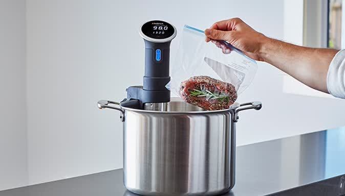 Tijd voor een perfect gekookte steak. Anova is een bedrijf dat zich specialiseert in professionele digitale kookhulpjes voor consumenten. De Precision Cooker is accessoire dat zich eenvoudig aan je pan laat bevestigen. Vervolgens stel je de temperatuur en de tijd in, et violá. Het is verbonden met wifi, waardoor je via de app je eten in de gaten kunt houden.