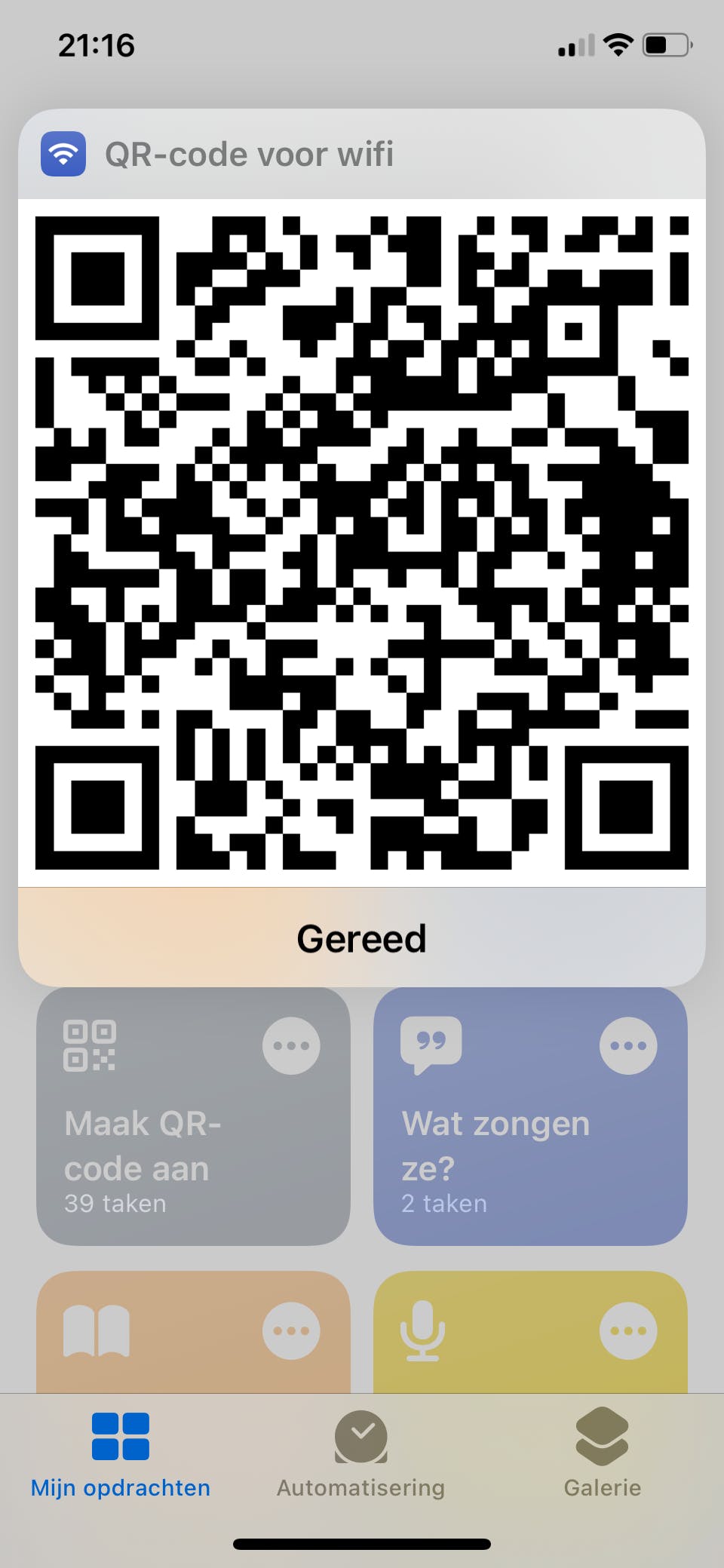 Een eenvoudige snelkoppeling die vaak van pas komt, is QR-code voor wifi. In deze opdracht noteer je eerst de naam en het wachtwoord van je wifi-netwerk. Als je daarna zegt ‘Hé Siri, QR-code voor wifi’ brengt de snelkoppeling een blokjescode op het scherm. Op die manier kun je deze gegevens eenvoudig delen met iemand anders die je toegang wilt geven tot je netwerk.