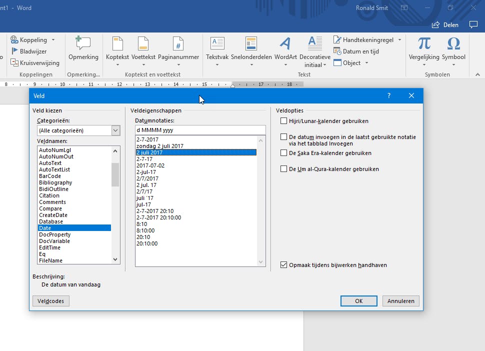 Je maakt het sjabloon net als een 'gewoon' Word-document. Enig verschil is dat alles wat je nu tikt en aanpast straks in je sjabloon al direct aanwezig is. Om te beginnen zetten we in ons - eenvoudige - sjabloon links bovenaan een NAW-blokje. Pas eventueel het lettertype naar smaak aan. Druk drie keer op Enter. Klik op de knop voor rechts uitlijnen en tik de plaatsnaam gevolgd door een komma en een spatie. Klik in het lint onder Invoegen op Snelonderdelen en dan Veld. Selecteer het veld Date en een datumaanduiding die je bevalt, gevolgd door een klik op OK. Vanaf nu staat altijd de correcte datum bovenaan je brief (klik eventueel op de datum en dan Bijwerken als het niet vanzelf gaat). Druk op Enter en kies in het lint onder Start voor links uitlijnen of eventueel uitvullen.