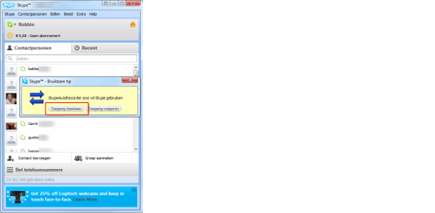 Geef Skype Auto Recorder toestemming om opnamen te maken van uw Skype-gesprekken.