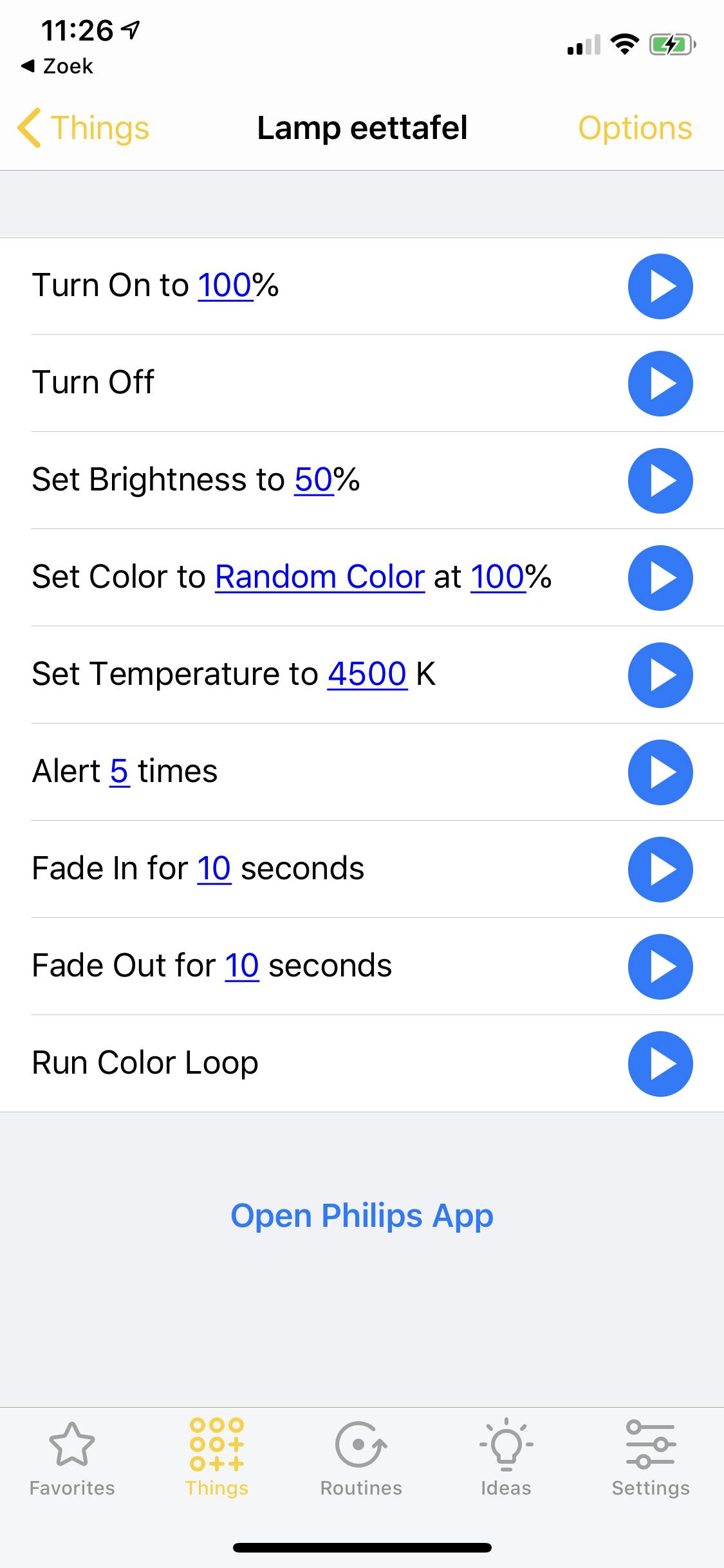 Om je apparaten te bedienen druk je in de app op het tabblad Things onderin. Vervolgens zie je daar alle apparaten die zijn gevonden en die je vanuit deze app kunt bedienen. Druk op het gewenste apparaat en je ziet een flink aantal voor gedefinieerde opties. Jammer genoeg kun je hier niet zelf eigen opties toevoegen, maar wellicht is dat iets dat we in de toekomst kunnen verwachten.