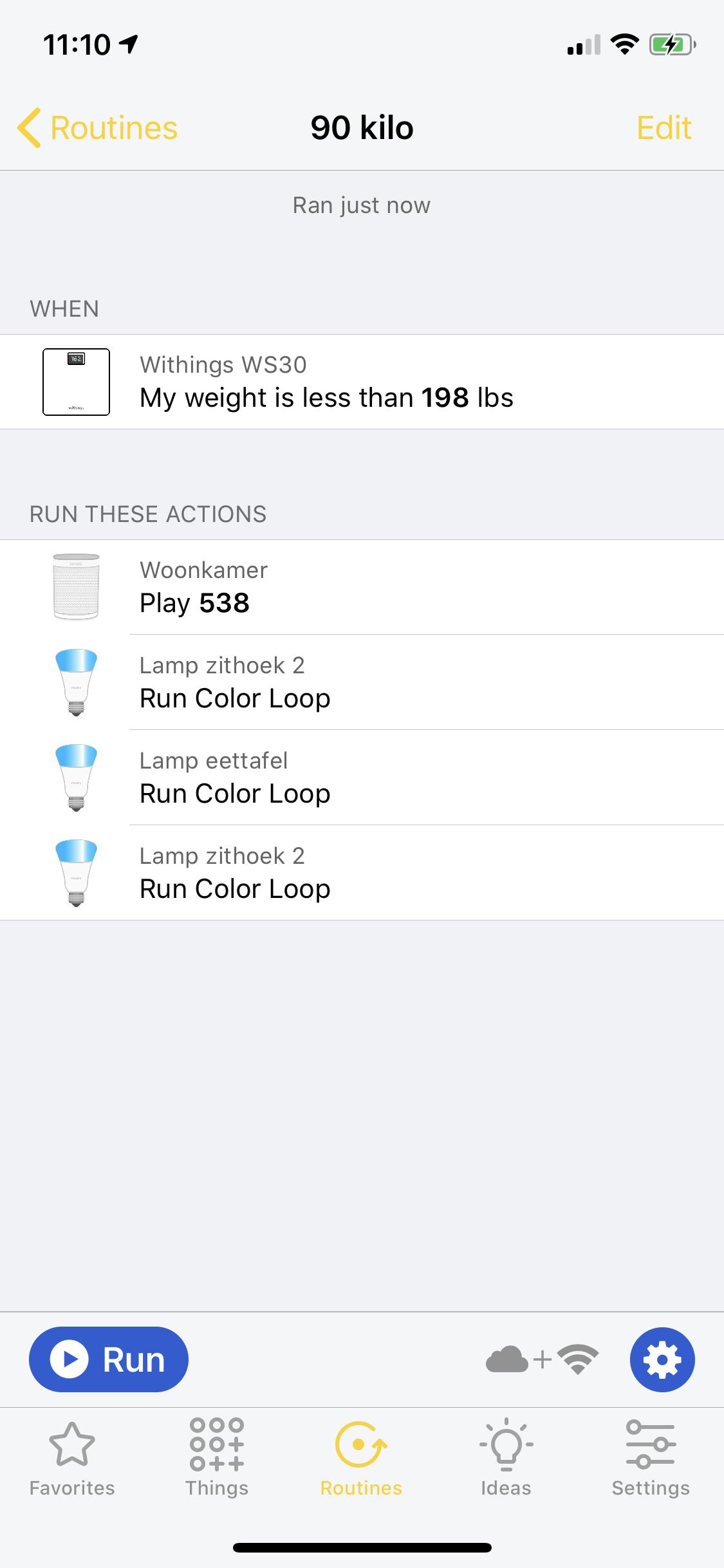 Om je te laten zien hoe apparaten samen kunnen werken, kiezen wij als trigger onze Withings interactieve weegschaal. Stel, om het maar even luchtig te houden, dat we willen dat iedereen in huis het mag weten als we eindelijk onder de 90 kilo wegen. Daarvoor drukken we op My weight is less than 120 lbs. Verander het getal naar het juiste gewicht (90 kilo is 198 lbs) en druk vervolgens op Add Action onder het kopje Run these actions. Vervolgens kiezen we onze Sonos luidspreker uit de lijst met apparaten, en geven we aan dat we de Playlist Afgevallen willen afspelen (die we natuurlijk in onze trots hebben aangemaakt). Vervolgens drukken we nogmaals op Add Action, en geven we aan dat de Philips Hue lampen een color loop moeten weergeven (lekker discogevoel). Dit doen we voor elke lamp in de woonkamer.