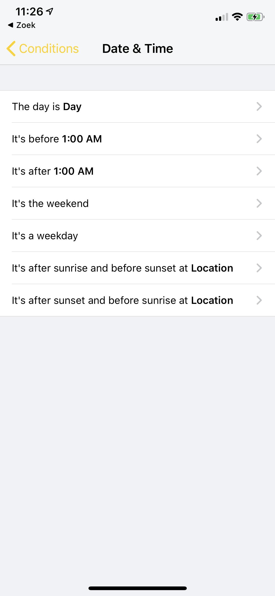 Druk daarvoor op Add Condition onder het kopje But only if. In het menu dat verschijnt kun je nu aangeven dat deze routine alleen mag afspelen wanneer het na zonsopgang is en voor zonsondergang. Op die manier kun je jezelf een hoop herrie in huis besparen, terwijl je er wel zeker van kunt zijn dat de routine wordt afgespeeld wanneer deze aan de voorwaarden voldoet. Geef de routine vervolgens een naam, zodat je deze later eenvoudig kunt herkennen. Deze naam is verder niet belangrijk voor het stemcommando, dus kun je er alles van maken wat je wilt.