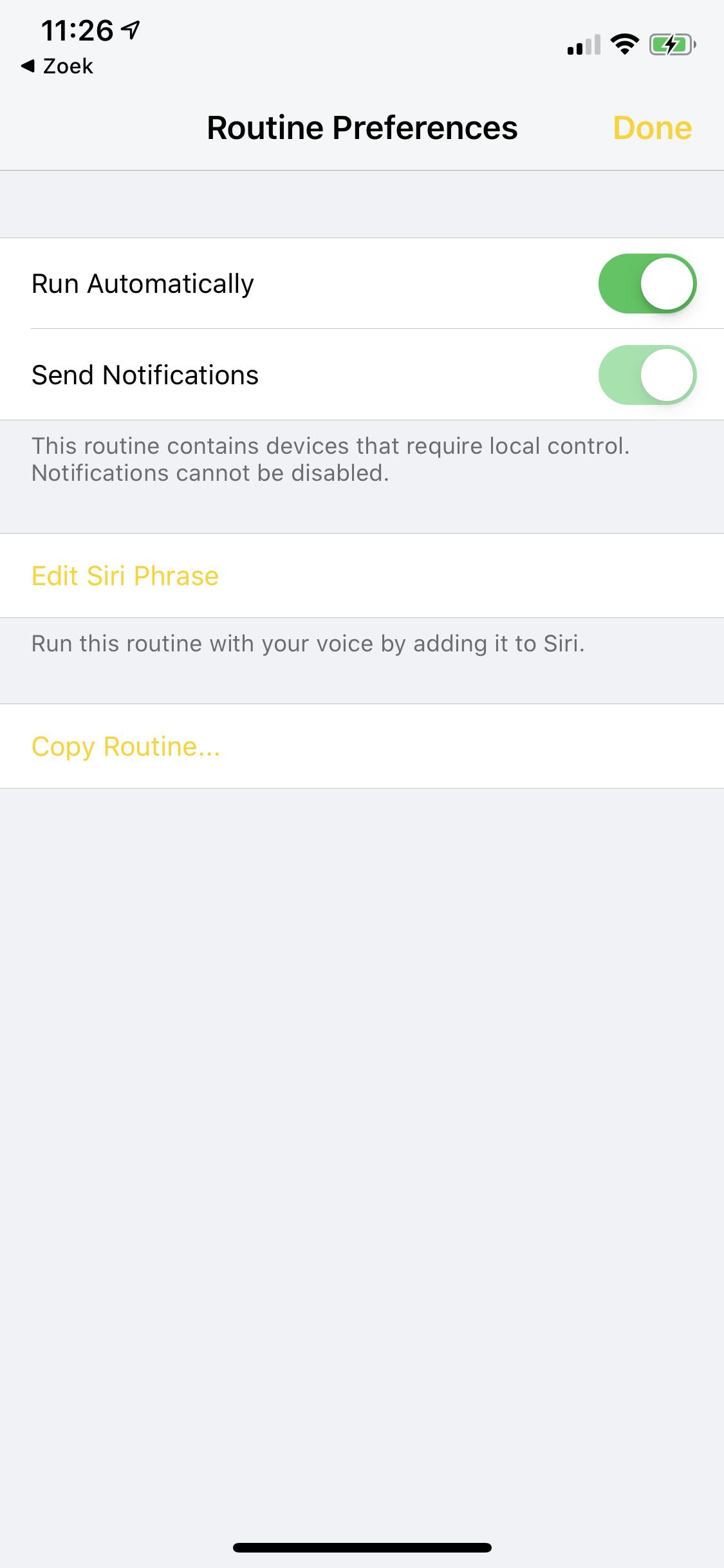 Druk op het tabblad Routines en vervolgens op de routine die je hebt gemaakt. Druk nu op het tandwiel en vervolgens op Edit Siri Phrase om aan te geven met welk stemcommando je deze routine wilt activeren. Wanneer je op Done drukt is de routine klaar om geactiveerd te worden met je stem (dat is direct een mooie manier om de routine te testen).