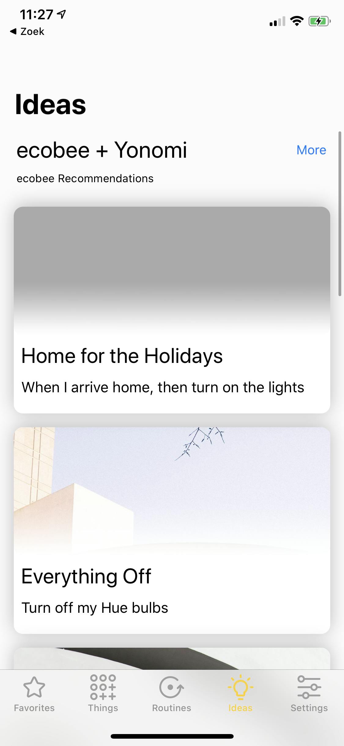 Wanneer je de app voor het eerst start en drukt op het tabblad Ideas onderin, dan is de inhoud daarvan nogal teleurstellend leeg. De reden daarvoor is echter een hele goede: de app voorziet je niet van een waslijst aan ideeën waar je niets aan hebt. In tegendeel, de app verzamelt eerst informatie over welke slimme apparaten je hebt, en vult het tabblad Ideas daarna uitsluitend met tips en ideeën van andere gebruikers die dezelfde apparaten hebben.