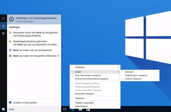 De zoekfunctie in Windows 10 is verdwenen uit het startmenu en vervangen door een knop naast je startknop. Omdat de zoekfunctie in Windows 10 verbeterd is ten opzichte van voorgaande versies, kun je overwegen om een zoekveld op je taakbalk te plaatsen. Hierdoor kun je direct een bestand, instelling of programma opzoeken door een gedeelte van de naam in te typen. Klik met de rechtermuisknop op de taakbalk en kijk bij Zoeken en kies voor Zoekvak weergeven, Zoekpictogram weergeven of Verborgen.