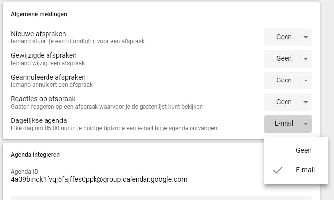 Wil je je dag doelgericht beginnen, laat Google je dan iedere ochtend om 05:00 je een mailtje sturen met de taken die voor die dag zijn ingepland. Selecteer hiervoor in de webweergave in de linkerkolom de betreffende agenda, klik op de puntjes zodat het menu uitklapt en selecteer Instellingen en delen. In het rijtje met opties zie je Meldingen voor afspraken die de hele dag duren. Wanneer je daarop klikt, kom je terecht bij de Algemene meldingen waar je bij het onderdeel Dagelijkse agenda de optie Geen in E-mail verandert.