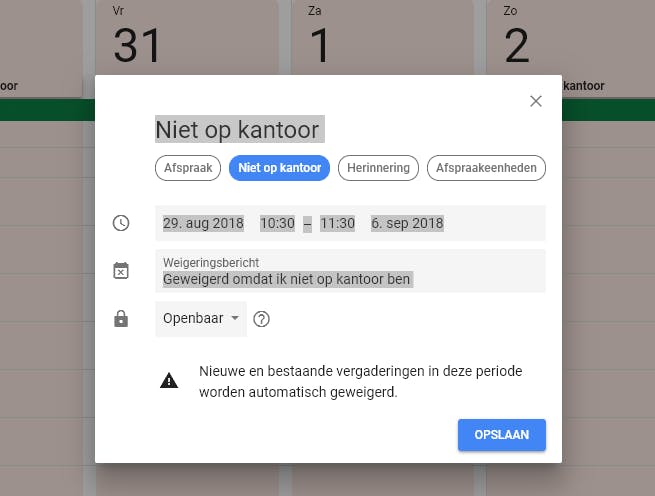 Wanneer je in Google Agenda een afspraak maakt, kun je kiezen voor Afspraak, eventueel Herinnering (als je die agenda hebt ingesteld), of Taak. Gebruik je G-Suite, de professionele en educatieve versie van Google, dan heb je ook de beschikking over de optie Niet op kantoor. We maken hier melding van, omdat Google aangeeft dat deze functie binnenkort voor alle gebruikers beschikbaar komt. Met Niet op kantoor kun je een bepaalde periode in je agenda blokken. Collega’s die dan toch een afspraak met je trachten te maken, ontvangen dan, via een persoonlijk bericht, een weigering. Op deze manier vermijd je dat iemand per abuis met je afspreekt terwijl je bijvoorbeeld op vakantie bent.