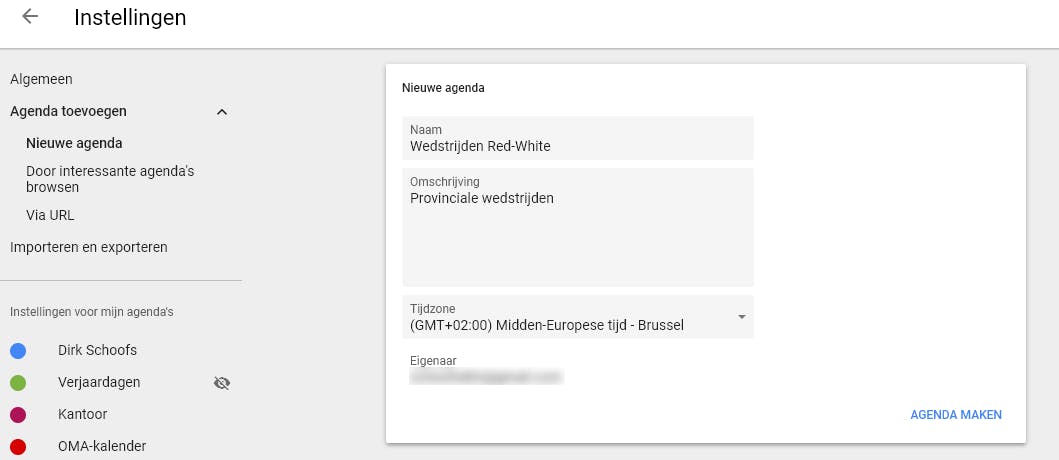 Wanneer je voor het eerst met Google Agenda gebruikt, heb je slechts één agenda (op de standaardagenda’s van Google na). Om productief met je leven om te gaan, is het soms gemakkelijker om verschillende agenda’s bij te houden, bijvoorbeeld voor familie, werk en sport. Om een nieuwe agenda te maken, klik je op het kleine plusteken naast De agenda van iemand anders toevoegen. Selecteer daar de optie Nieuwe agenda. Geef de agenda een naam, een beschrijving en bepaal eventueel een tijdzone.