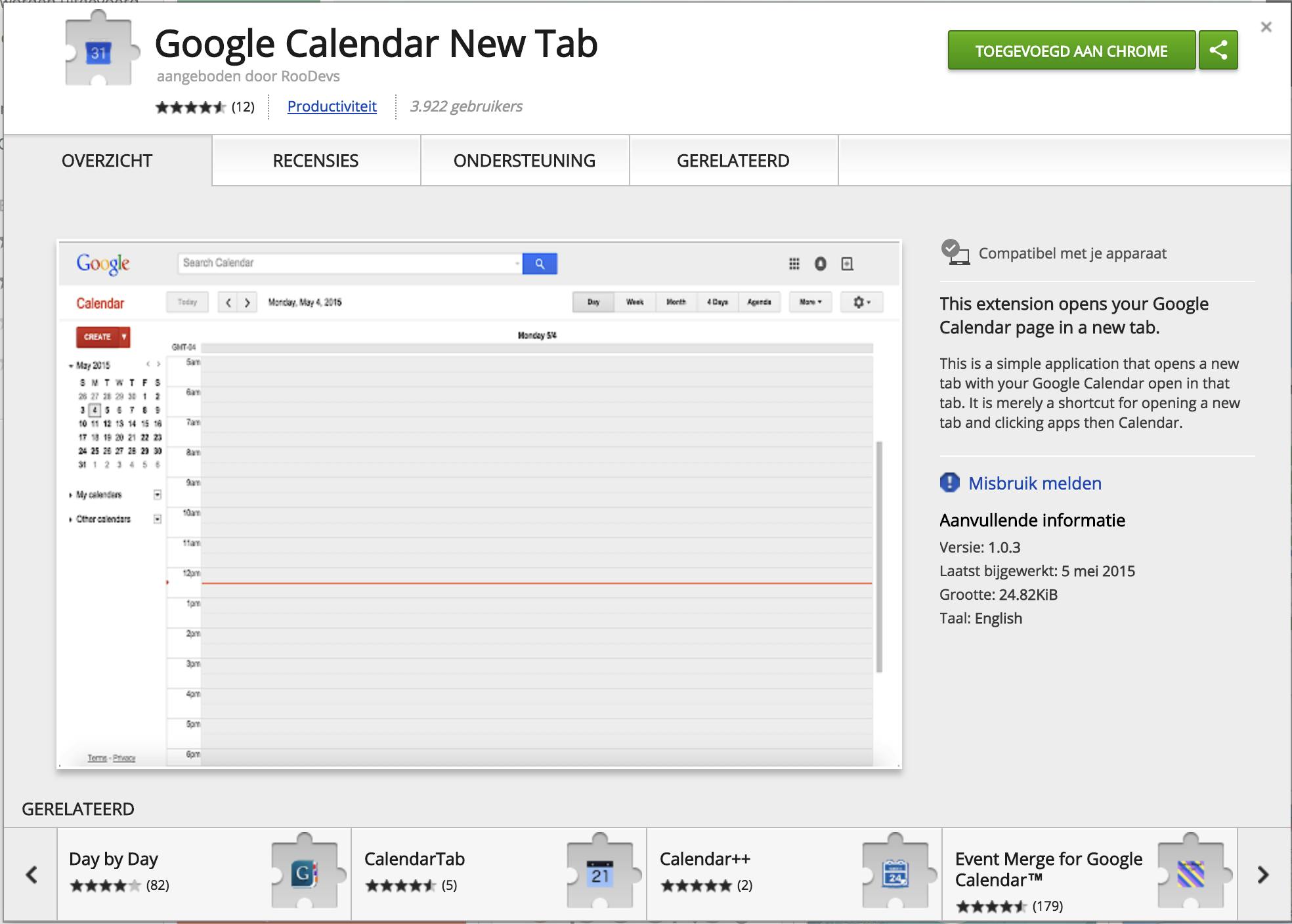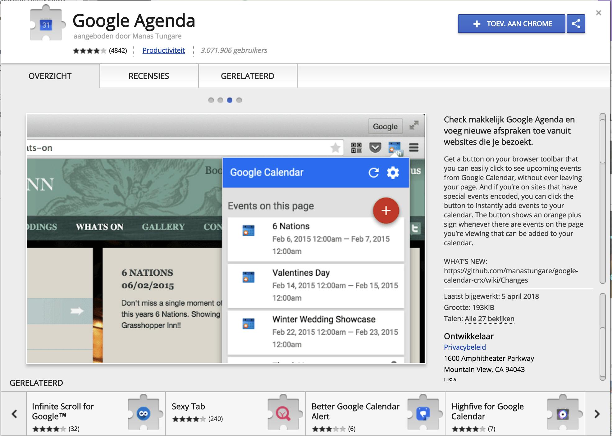 De ontwikkelaars van Google hebben een eigen Chrome-extensie ontwikkeld om snel in deze browser de afspraken van de huidige dag te zien. Wanneer je op de toegevoegde knop klikt, krijg je de aanstaande Google Agenda-items in een lijstje te zien. In de voorkeuren van de extensie geef je aan welke agenda’s op deze manier beschikbaar zijn. Je kunt ook een evenement toevoegen door op de plusknop te klikken. De Chrome-extensie kun je toevoegen in de Chrome Web Store.