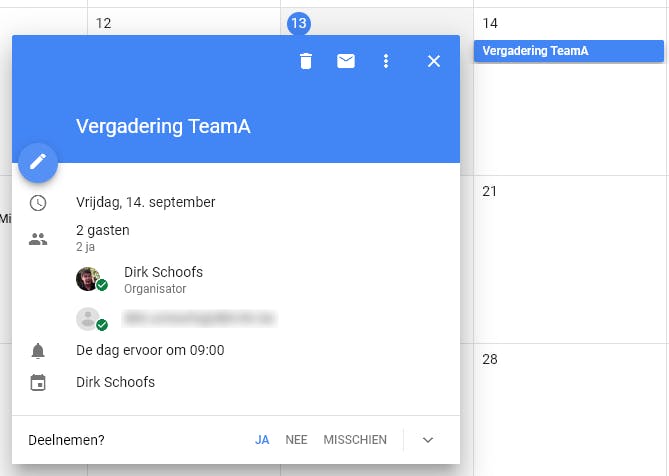 Een avondje bijkletsen, samen sporten of een simpele lunch plannen, het kan een hele opgave zijn om zoiets vast te leggen. Om een datum te prikken, klik je rechtsonder op de rode knop met het plusteken. In het pop-upvenster vul je alle details van de nieuwe afspraak in en voeg aan de rechterkant de mensen toe met wie jij de afspraak wilt maken door hun e-mailadressen in te vullen. Google stuurt vervolgens een e-mail waarin ze kunnen aangeven of ze wel of niet akkoord gaan met de afspraak.