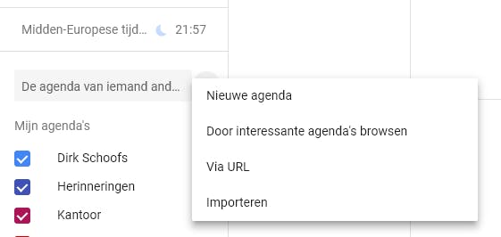 Werk je veel met één of meerdere personen samen, dan is het wel zo praktisch om in te kunnen zien of ze beschikbaar zijn of waar ze uithangen. Om een agenda van iemand anders aan jouw agenda toe te voegen, heb je het mailadres of de unieke url van de agenda nodig. De nieuw toegevoegde agenda verschijnt vervolgens onder Andere agenda’s. Om andermans agenda via e-mail toe te voegen, ga je naar de lijst met agenda’s in het linkerdeelvenster. Je typt het e-mailadres in in het vak Agenda van iemand anders toevoegen. Wil je de gedeelde agenda toevoegen via een iCal-koppeling, klik dan op het plusje en kies Via URL uit het menu.