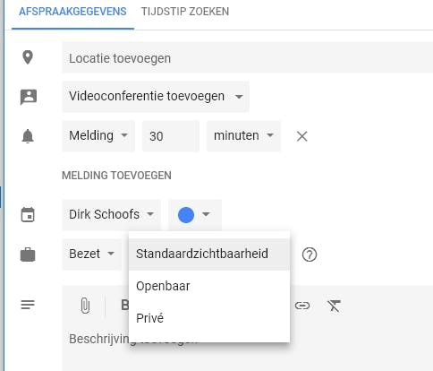 Een agenda delen is erg handig, maar soms zijn er privacygevoelige afspraken waarvan je niet wilt dat iemand anders de details ervan kan inzien. Dit kun je aanpassen door bij het maken of bewerken van een afspraak bij het boekentaspictogram de zichtbaarheid van de afspraak in te stellen. Voor privacygevoelige afspraken zet je die zichtbaarheid op Privé en vergeet vooral die instelling niet op te slaan!