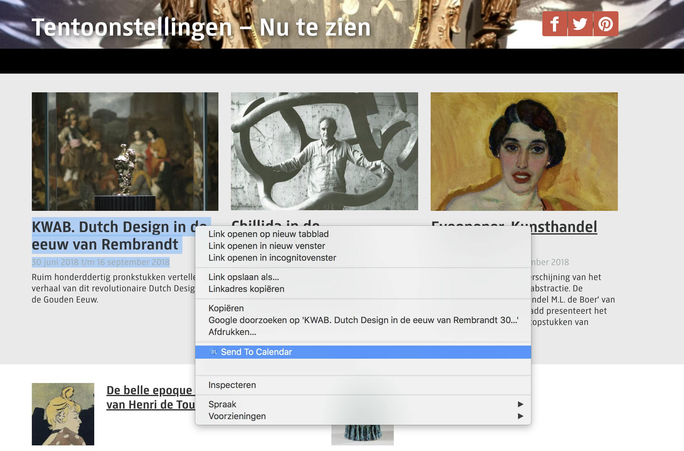 Een extra functie die wij niet meer kunnen missen, is Send to Calendar. Het is een product van Boris Masis, productmanager bij Google. Nadat je deze extensie in Chrome hebt geïnstalleerd, hoef je een evenement niet meer handmatig over te typen in je agenda. Je selecteert op de website van het evenement de titel, datum, tijd en eventueel locatie en met een klik op de rechtermuisknop geef je dan de opdracht Send to Calendar. Google Agenda vult direct de gegevens in als een nieuw evenement, je hoeft zelf alleen nog maar aan te geven in welke agenda jij het evenement wilt hebben staan.