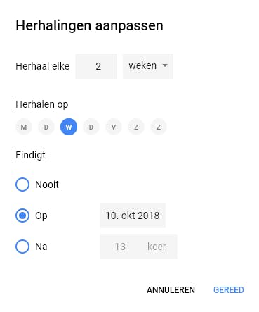 Wanneer je bijvoorbeeld iedere dinsdagochtend een vergadering hebt, hoef je daar niet iedere keer een nieuwe afspraak voor te maken. Als je een vergadering (of een andere terugkerende afspraak) aanmaakt en de titel, datum en tijd invoert, kun je bij de opties aangeven of deze afspraak zich moet herhalen. Google biedt je de keuze: elke dag, week, maand of jaar. Klik je op de knop Aangepast, dan kun je complexere herhalingen formuleren, zoals: de afspraak vindt plaats om de twee weken, maar eindigt op 10 oktober.