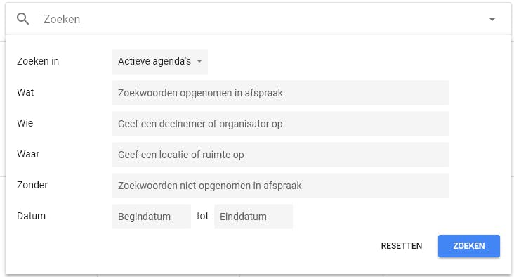 Ben je op zoek naar een specifieke gebeurtenis of afspraak, klik dan bovenin op het vergrootglas en vervolgens op het pijltje aan de zijkant van het zoekvenster (Zoekopties) voor een geavanceerde zoekopdracht. In het uitklapvenster kun je bepalen in welke agenda’s je wilt zoeken, welke perso(o)n(en) je zoekt, of waar de afspraak plaatsvindt. Ook kun je zoektermen uitsluiten of zoeken binnen een specifiek datumbereik.