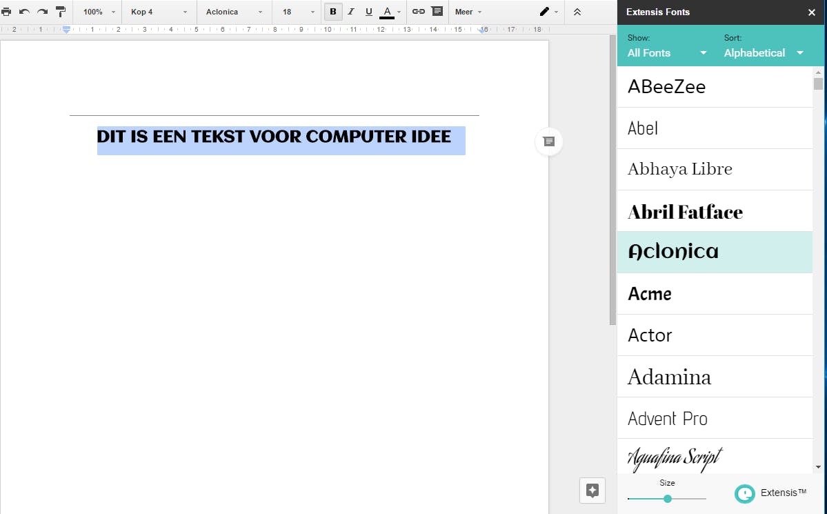 Varieer je regelmatig met lettertypes, dan is de add-on Extensis Fonts wel iets voor je. Die toont namelijk alle beschikbare lettertypes in een apart deelvenster, inclusief voorbeeldweergave. Je kunt tevens filteren op specifieke types zoals (Sans) Serif en Handwriting. Heb je een geschikt lettertype gevonden, dan selecteer je het deel van de tekst dat je in dat font wilt, en klik je het lettertype in het deelvenster aan.