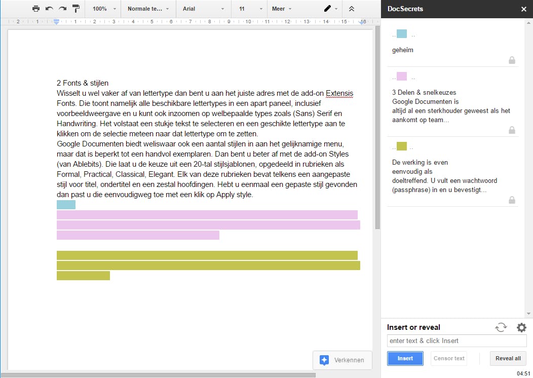 Google Documenten is altijd al sterk geweest als het aankomt op teamwork. Werk je namelijk samen in een document, dan zie je live waar de ander zich in het document bevindt en wat diegene typt. We kunnen ons echter voorstellen dat je niet altijd elk tekstfragment direct zichtbaar wilt maken voor je teamleden. Bijvoorbeeld als je nog even wilt nadenken over hoe je iets formuleert. Daarbij krijg je hulp van de add-on DocSecrets. Die werkt zeer eenvoudig. Je vult een wachtwoord (passphrase) in en bevestigt met Start. Vervolgens positioneer je de cursor in je document op de plaats waar de ‘geheime tekst’ hoort te komen, waarna je die tekst tikt of plakt in het vak bij Enter tekst & click Insert. Zodra je op Insert klikt, wordt de tekst in je document geplaatst – maar wel automatisch direct vervangen door gekleurde balken. De tekst die achter deze balken schuilt kun je in het venster aflezen. Wil je de tekst overal in het document leesbaar maken, dan klik je Reveal all aan.