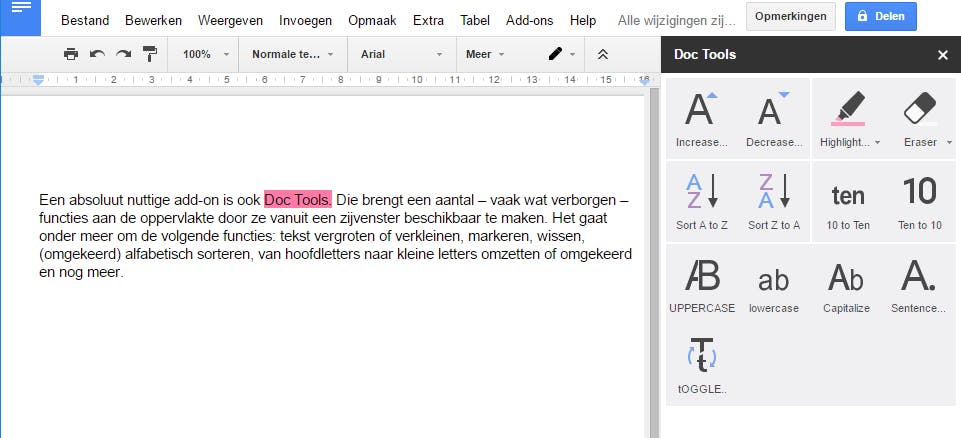 Een absoluut nuttige add-on is ook Doc Tools. Die brengt een aantal – vaak wat verborgen – functies aan de oppervlakte door ze vanuit een zijvenster beschikbaar te maken. Het gaat onder meer om de volgende functies: tekst vergroten of verkleinen, markeren, wissen, (omgekeerd) alfabetisch sorteren, van hoofdletters naar kleine letters omzetten of omgekeerd en nog meer.