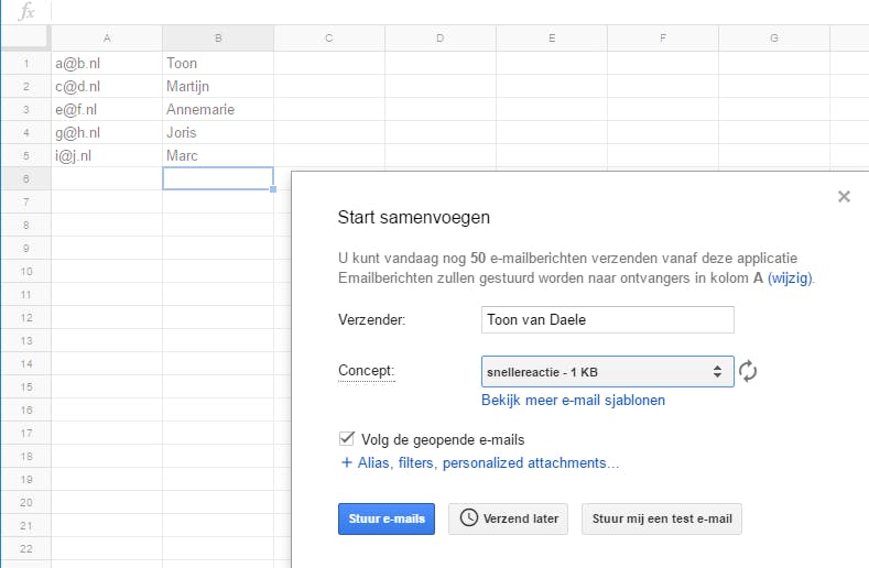 Microsoft Word biedt de functie Verzendlijsten aan, waarmee je makkelijk gepersonaliseerde e-mails kunt versturen. Dat kan nu ook vanuit Google Spreadsheets, in combinatie met Gmail. Althans, wanneer je in Spreadsheets de add-on Yet Another Mail Merge installeert. Allereerst zorg je ervoor dat je het te versturen bericht klaar hebt staan in de mailmap Concepten in je Gmail. Vervolgens open je Spreadsheets en vul je de e-mailadressen van de beoogde ontvangers onder elkaar in een kolom in. Je start daarna de bewuste add-on op en klikt op Start samenvoegen. Er verschijnt een venster waarin je naar de kolom met adressen verwijst (via de optie Wijzig) en aangeeft welk bericht je precies wilt versturen. Met een druk op de knop Stuur e-mails worden de berichten verzonden – gratis tot vijftig per dag.