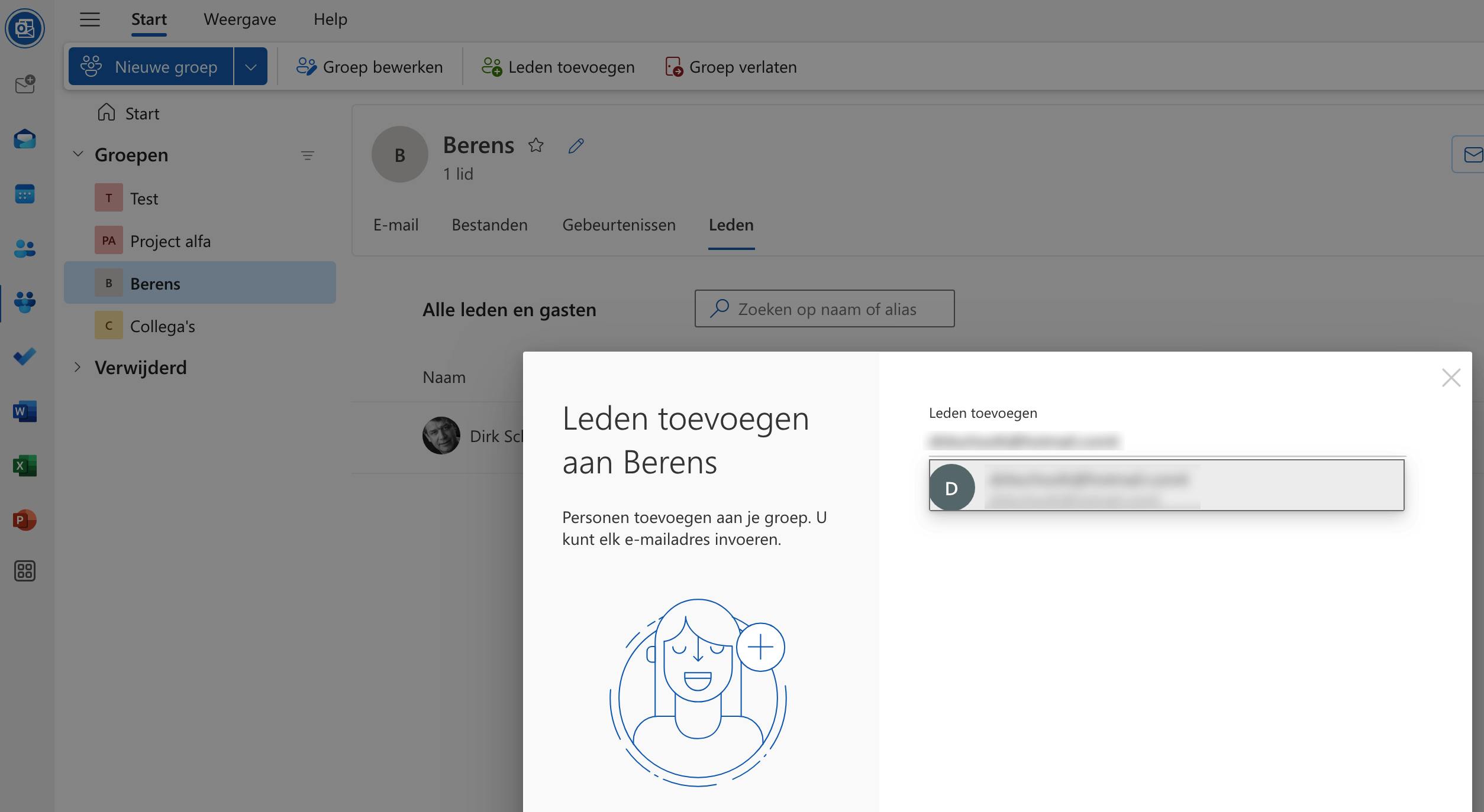 Daarna kun je een groep maken. Klik op het pictogram Groepen in de linkerkolom van Outlook. Linksboven zie je de knop Nieuwe e-mail, maar als je op het pijltje daarnaast klikt, kun je Nieuwe groep selecteren. In de pop-up geef je deze groep een duidelijke naam. Bij Beschrijving vul je het doel van de groep in. De groepsleden zullen een e-mail ontvangen waarin dit aan hen wordt meegedeeld. Daarna klik je op de blauwe knop Maken. In de volgende stap kun je de leden van de groep toevoegen. Aan de linkerkant bij Groepen verschijnen alle groepen die je op die manier hebt aangemaakt. Om extra leden toe te voegen selecteer je eerst de groep en daarna klik je op Leden toevoegen. Dat kan door het e-mailadres in te typen.