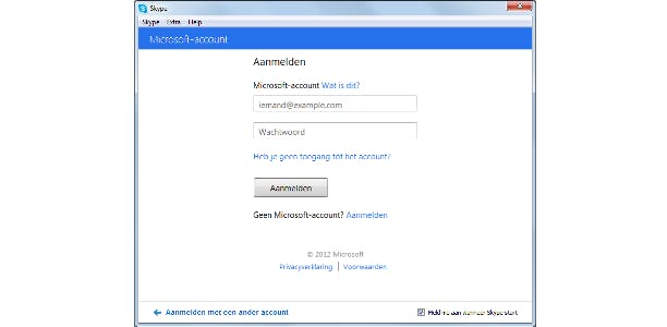 Je wordt na de installatie gevraagd om in te loggen met je Microsoft-account. Dit is precies hetzelfde als het Windows Live ID waarmee je toegang krijgt tot andere diensten zoals Hotmail, SkyDrive, Xbox LIVE of je Windows Phone. Voer je accountnaam en wachtwoord in en tik op Aanmelden. Je kunt ook inloggen met een ander account. Klik hiervoor door naar Aanmelden met een ander account en gebruik de logingegevens van een Facebook- of Skype-account.