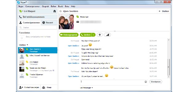 In de linkerkolom krijg je een overzicht van de contacten. Een groen Skype-icoontje betekent dat een contactpersoon online is, een geel icoontje staat voor afwezig. Iemand met een rood icoontje wil niet gestoord worden en een wit icoontje staat voor offline.