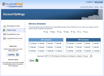 Vervolgens kunt u instellen hoeveel e-mails NutshellMail u dagelijks mag sturen. De dienst aanpassen naar uw eigen wensen is erg eenvoudig via het gebruiksvriendelijke dashboard. Onder Messaging Accounts kunt u sociale netwerken toevoegen of verwijderen en Delivery Times laat u toe om in te stellen op welke dagen en uren u een overzicht van uw profielsites wenst te ontvangen.