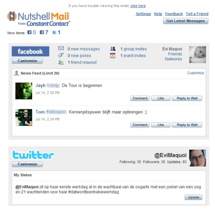 Vervolgens krijgt u een NutshellMail in uw mailbox met de belangrijkste statusupdates van uw vrienden. U kunt rechtstreeks commentaar geven op Facebook-berichten of Twitter-berichten retweeten. Via de Customize-knop in de e-mail kunt u eventueel instellen waarvan NutshellMail u op de hoogte mag brengen. Daarnaast is het ook mogelijk om het aantal updates per Facebook-categorie (bijvoorbeeld prikbordberichten, statusupdates, verjaardagen, fototags, vriendschapsverzoeken enzovoorts) te begrenzen tot een maximum of filters in te stellen. Twitter-gebruikers kunnen dan weer op de hoogte gebracht worden van nieuwe berichten of volgers. NutshellMail is volgens ons een aanrader voor wie actief is op meerdere sociale netwerksites en zijn/haar kostbare tijd niet wilt spenderen aan het oeverloos controleren van profielpagina's.
