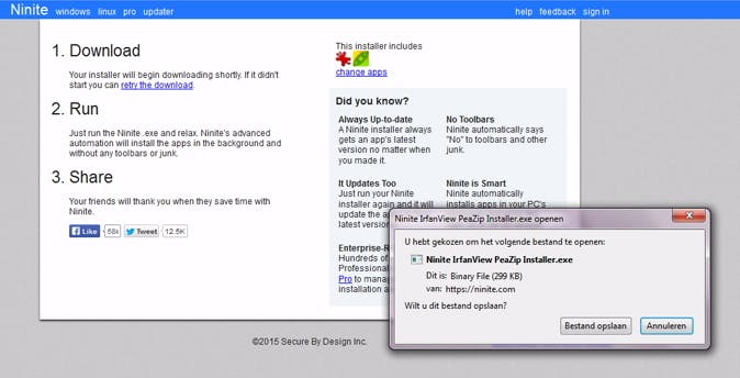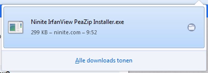 Het programma maakt van jouw selectie één gezamenlijk downloadpakket. Het op maat gemaakte installatiebestand wordt automatisch binnengehaald. Gaat er toch iets mis, dan gebruik je de knop Retry the download. Start na het downloaden de installer op door erop te dubbelklikken, en wacht tot alles netjes is geïnstalleerd. De procedure wordt niet onderbroken door allerlei keuzevensters en waarschuwingen. Je hoeft nooit of nergens op de Next-knop te klikken. Ninite weet bovendien dat je een hekel hebt aan overbodige werkbalken of add-ons waar je niet om hebt gevraagd. Het zal al deze rotzooi automatisch afslaan zonder dat jij een vinger hoeft uit te steken. Je kunt dus niet per ongeluk een foute optie aanvinken, ideaal.