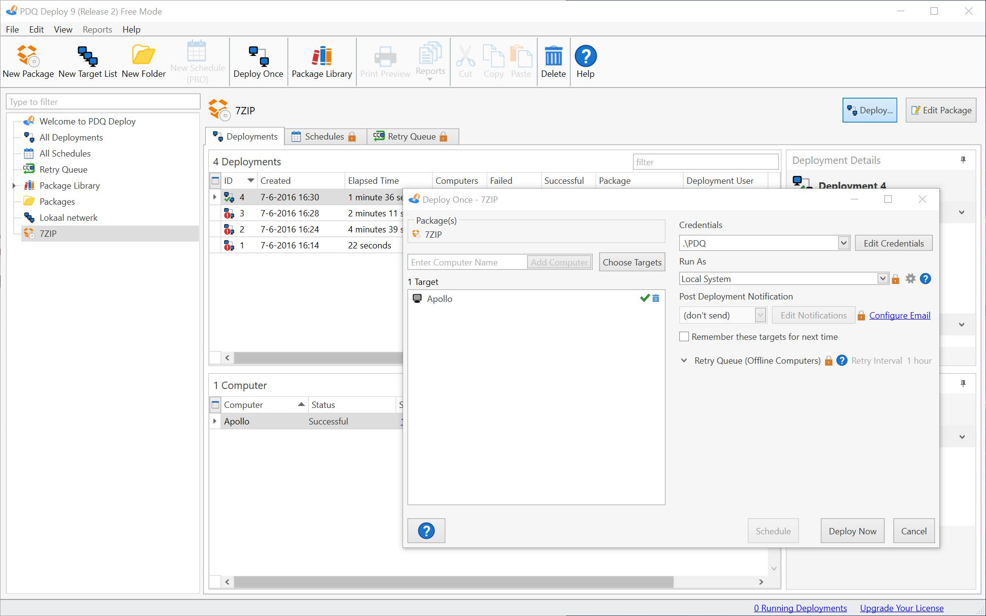PDQ Deploy is beschikbaar in drie varianten, namelijk gratis, professional en voor bedrijven. De gratis versie stelt je in staat om exe, msi en msp-bestanden uit te rollen naar andere pc’s in het netwerk.