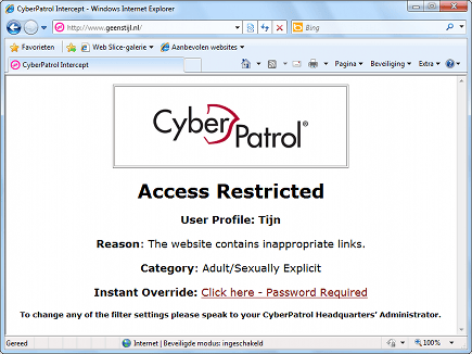 CyberPatrol biedt bij iedere blokkering meteen een ‘override’ (beheerwachtwoord nodig).