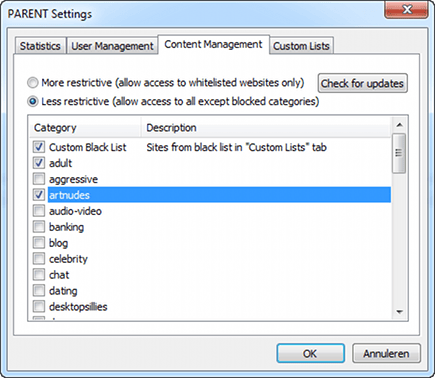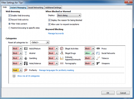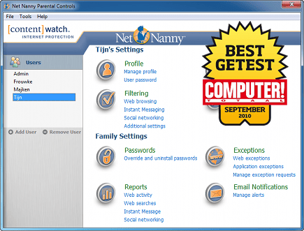 Het programma voor ouderlijk toezicht van Net Nanny biedt heel veel vrijheid. Het is mogelijk om één profiel voor alle gebruikers in te stellen, ieder account een eigen profiel te geven of profielen te koppelen aan Windows-gebruikers. Het biedt filtering van hoog niveau en kan als een van de weinige programma’s ook onbekende sites blokkeren of toestaan op basis van taalgebruik op de site. Helaas werkt dit alleen op het Engelse deel van het internet, Net Nanny is een volledig Engelstalig product. Behalve verbieden kan Net Nanny ‘foute sites’ na een waarschuwing ook altijd toestaan. Als een van de eerste heeft Net Nanny ook ruim aandacht voor sociale netwerken.