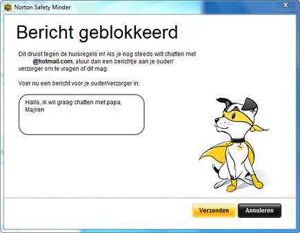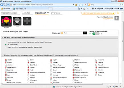 Norton Online Family lijkt veel op Windows Live Family Safety van Microsoft maar verslaat deze op verschillende punten. De installatie bestaat uit twee delen. Eerst moet u zich aanmelden bij de Norton-website, vervolgens installeert u een klein stukje software op iedere pc of Mac die door de kinderen gebruikt wordt. Norton speelt geen verstoppertje, zodra een gebruiker inlogt verschijnt een melding over de aanwezigheid van de software. Ook verschijnen er duidelijke meldingen als activiteiten niet zijn toegestaan. Een verbod hoeft nooit een eindstation te zijn, kinderen kunnen de ouders altijd vragen dit op te heffen. Deze berichten kan de ouder lezen in de webportal en daar ook accorderen. Ook Norton kijkt inmiddels naar sociale netwerken maar beperkt zich tot Facebook en LinkedIn; Twitter en het Nederlandse Hyves ontbreken. Hoewel netjes vertaald, is Online Family een Engels product wat soms in de filtering te merken is. Net als met Net Nanny is het ook bij Norton mogelijk kinderen te waarschuwen voor slechte sites en deze dan toch toe te staan.