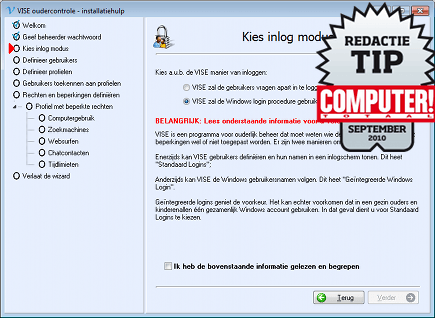 De winnaar van de vorige test (juli 2008) is nog altijd een van de mooiste programma’s voor ouderlijk toezicht en bovendien volledig Nederlandstalig. Voor zowel ouders als kinderen is goed te volgen wat het programma doet en waarom. De installatie is één lange wizard die zowel het programma als de gebruikers configureert. Dat kunnen eigen VISE-accounts zijn maar ook Windows-gebruikersaccounts. Per gebruiker kan een profiel worden gemaakt voor webtoegang, het blokkeren van applicaties, toegang tot folders en bestanden, chatcontrole op tekst en nieuwe contacten. Vise Oudercontrole is wel compatibel met Windows 7 maar alleen met de 32-bit versie. Wanneer een 64bit-versie verschijnt is nog onbekend.