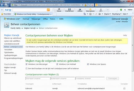 Windows Live Family Safety kan ook contactpersonen bewaken.