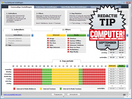 YourSafetynet is nieuw in onze tests en meteen het meest gebruiksvriendelijke product in de test. YourSafetynet is een Nederlands product dat net als Net Nanny bij het filteren van websites ook de webpagina’s leest en op basis van woordgebruik kan blokkeren. Alle items die in het programma te configureren zijn, bevinden zich binnen vier tabbladen, en zijn altijd redelijk snel te vinden. Bij het bepalen van tijden waarop iemand de computer mag gebruiken, maakt YourSafetynet onderscheid tussen internet en media. Tot ‘media’ rekent het programma chat, offline en online gamen, voip, gebruik van p2p-software en het bezoeken van sociale netwerksites als Hyves, MySpace en Sugababe. Bij de filtering zijn zowel zwarte als witte lijsten mogelijk, evenals het verbieden van programma’s. Als extra’s biedt YourSafetynet een aantal opties zoals het toepassen van tekstherkenning om gebruik van online chatrooms te detecteren, de mogelijkheid usb-poorten en webcams uit te schakelen, en zelfs een ‘alarmknop’ waarmee het kind een schermafbeelding maakt wanneer er iets ongewensts in beeld verschijnt.